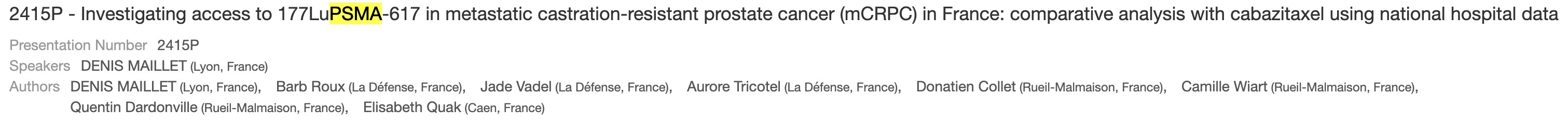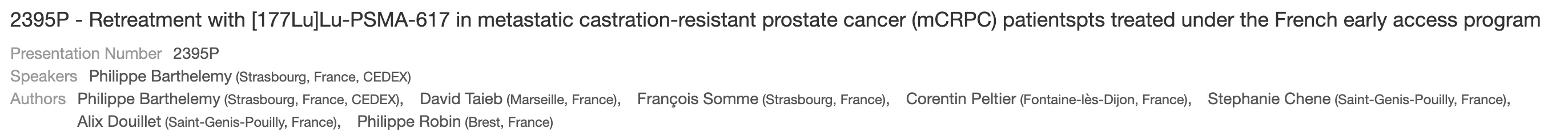 [4] 2389P - Final analysis of patients treated with [177Lu]Lu-PSMA-617 in early access program in metastatic castration-resistant prostate cancer (mCRPC) in France (2389P - 프랑스 조기 사용 프로그램(EAP)을 통해 [¹⁷⁷Lu]Lu-PSMA-617으로 치료받은 전이성 거세저항성 전립선암(mCRPC) 환자의 최종 분석)