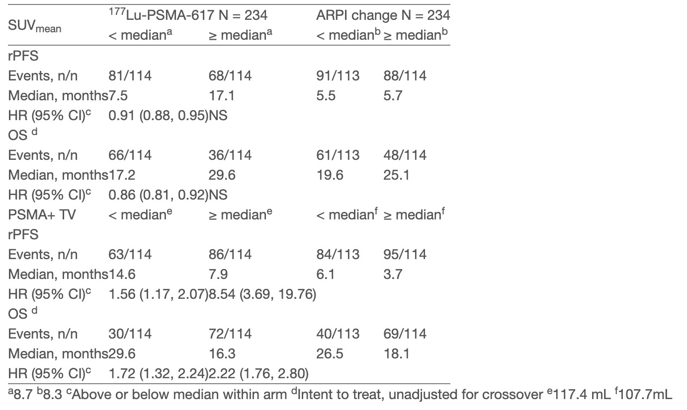 PSMA + TV의 경우, ¹⁷⁷Lu-PSMA-617 치료군과 ARPI 변경군 모두에서 이 수치가 낮을수록(즉, 종양의 총량이 적을수록) rPFS와 OS가 더 길게 나타나는 경향을 보였음.
