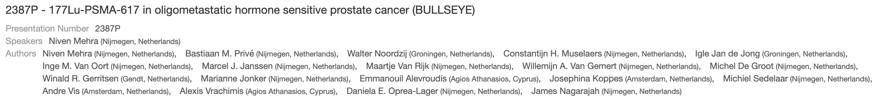 [10] 2387P - 177Lu-PSMA-617 in oligometastatic hormone sensitive prostate cancer (BULLSEYE) (2387P - 소수 전이성 호르몬 반응성 전립선암 환자에서 [¹⁷⁷Lu]Lu-PSMA-617의 효과를 평가한 BULLSEYE 연구)